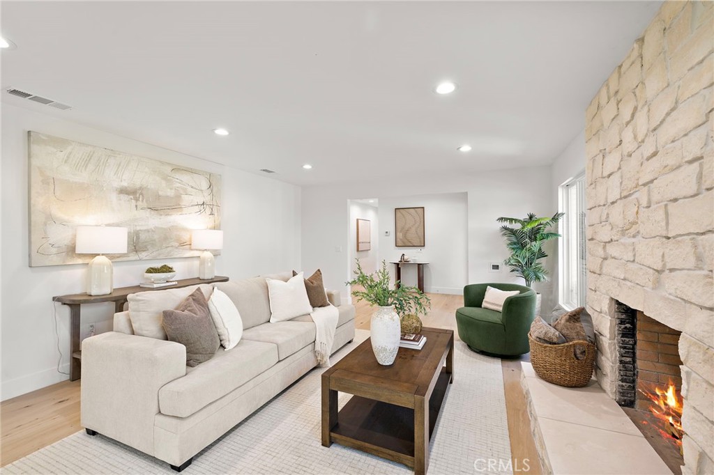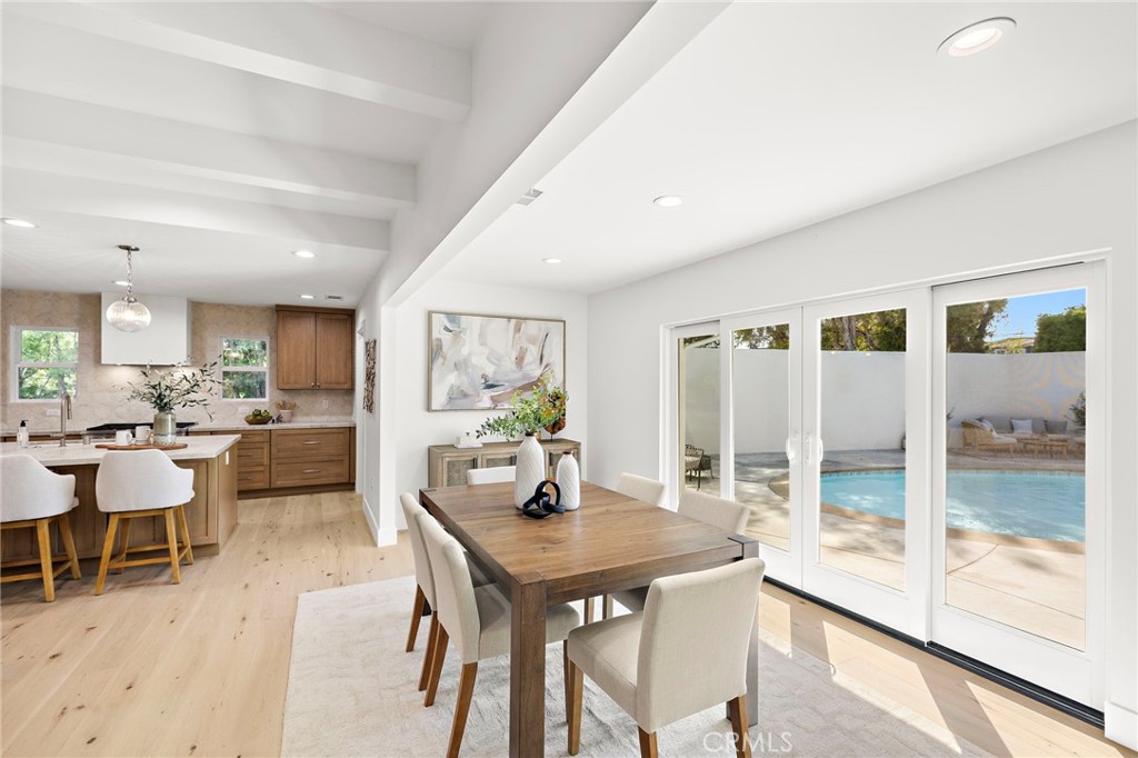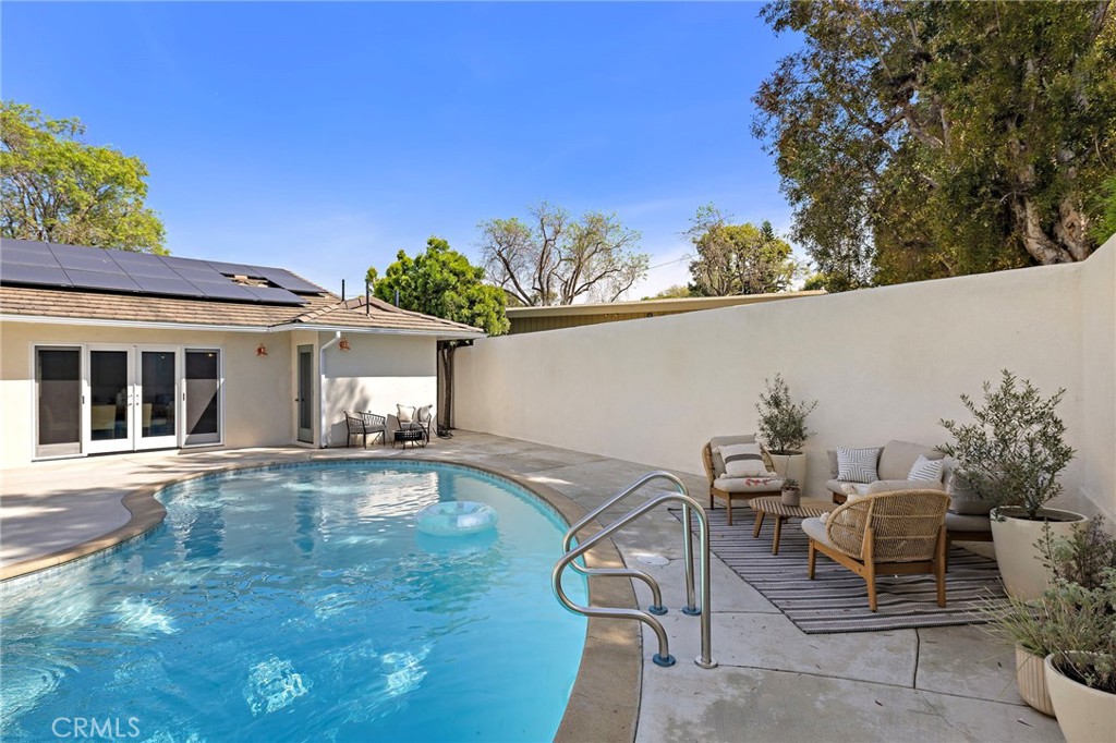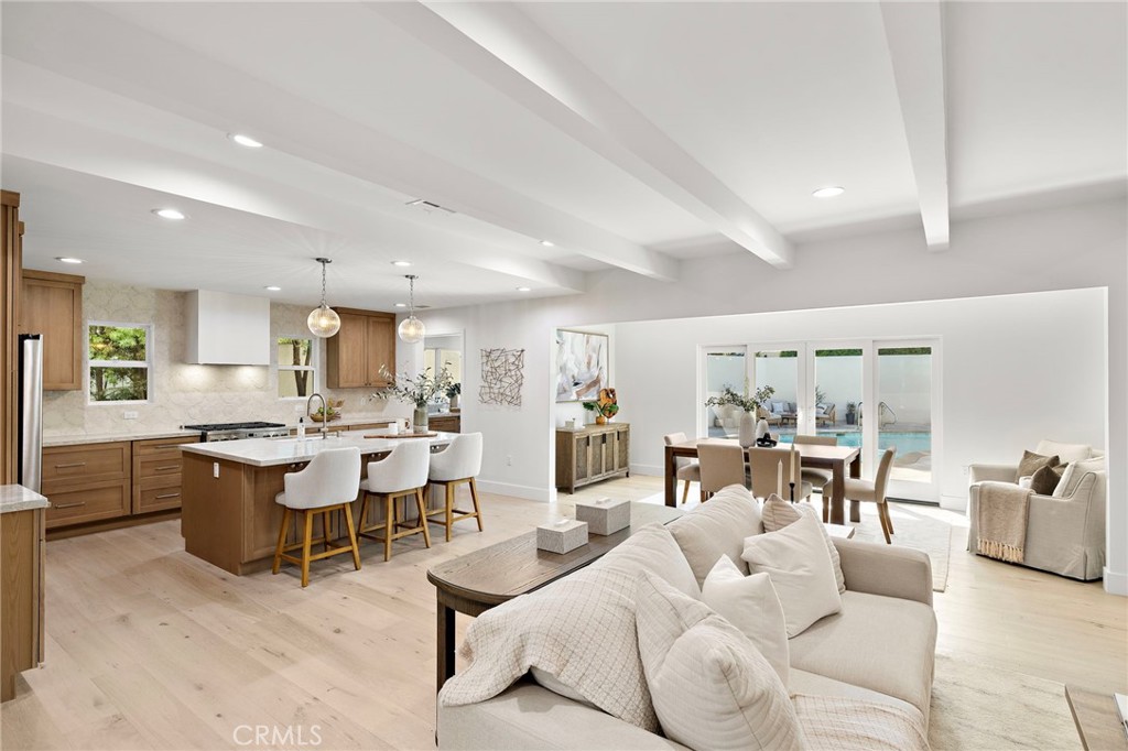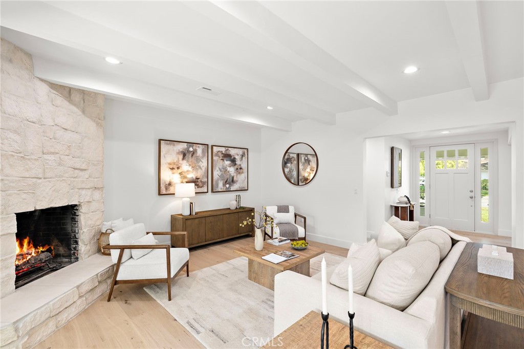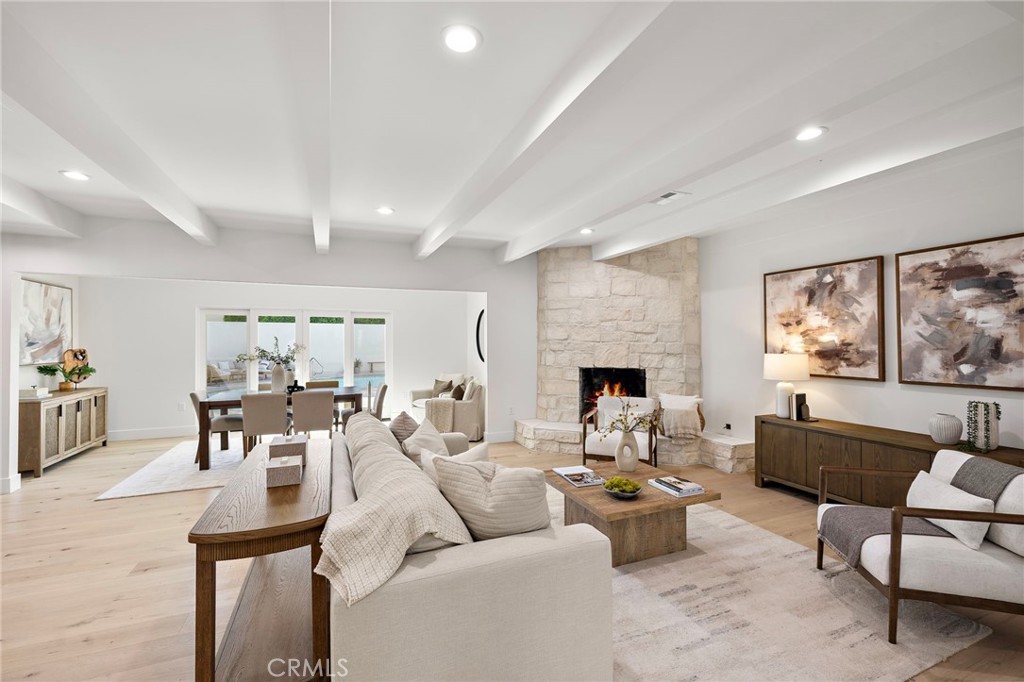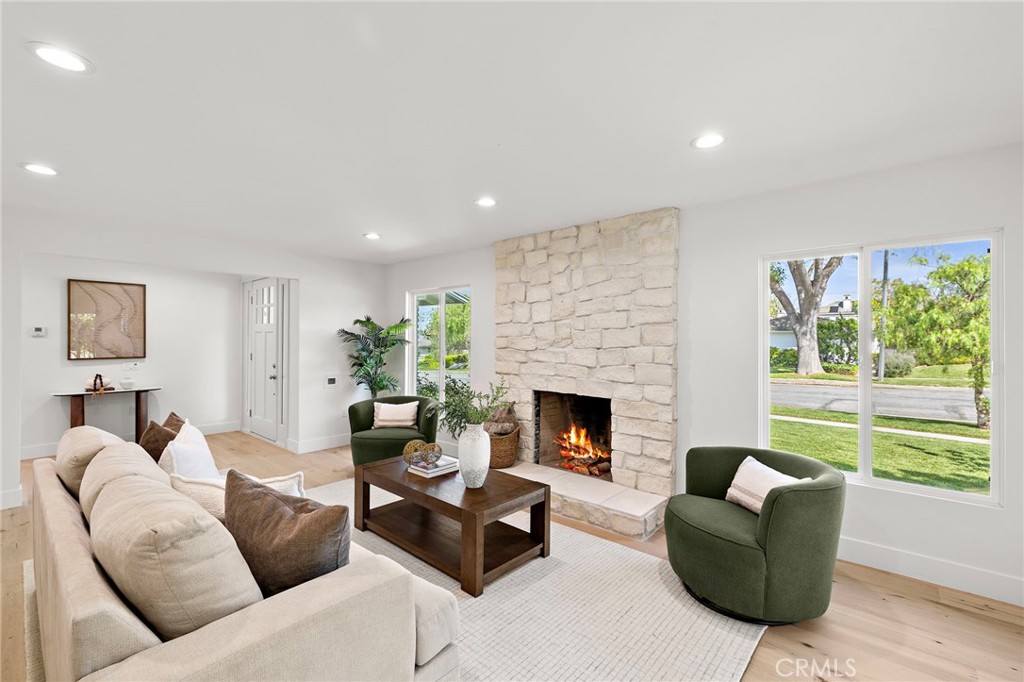 PARK ESTATES | This beautifully upgraded residence offers a rare opportunity to own a home with brand-new finishes and a fresh, never lived in feel. Completely transformed with today's most desired features, this stunning residence embodies the warmth and ease of an organic California ranch style home where curated design, natural materials, and thoughtful craftsmanship come together in perfect harmony. Every space has been thoughtfully redesigned with a focus on effortless indoor-outdoor living featuring all new engineered oak flooring and a cohesive palette that guides you through beautifully redefined spaces. The formal living room (potential home office/flex space/fourth bedroom) off the entry features a fireplace and sliders leading to a serene private patio, one of several outdoor spaces throughout the property. The gorgeous and BRAND NEW open concept kitchen features a large island with Taj Mahal quartzite, custom backsplash, generous use of cabinetry, all-new appliances, and an inviting flow into the family room. A walk-in butler's pantry with beverage service, cabinetry, and wine fridge elevates both daily living and effortless entertaining. A well-placed powder room off the kitchen also connects directly to the pool. The family room centers around a cozy fireplace and opens to the dining room. All the bedrooms have new Milgard windows and bathrooms have been fully upgraded with designer-selected tilework, fixtures, and finishes. The separate bedroom wing boasts three bedrooms and two additional bathrooms. The primary suite off the pool features backyard views, a walk-in closet and a stunning spa-inspired bath. The exterior is just as thoughtfully renewed...the pool has been recently plastered with new waterline tile accents as well as multiple patio areas creating endless opportunities for outdoor living at its finest. There is a long, elegant driveway with an electronic gate which leads to the finished two-car garage (optional casita/gym space). Additional upgrades include tankless water heater, central air, paid off solar panels, new doors, & new Milgard windows. Lovely curb appeal with all new sod, landscaping, & lighting. Residents enjoy the gorgeous tree-lined streets, wide lots, nearby park, and excellent schools. Set on a prime lot in one of the neighborhood's most desirable locations, this home offers the perfect blend of elevated design and Park Estates living.